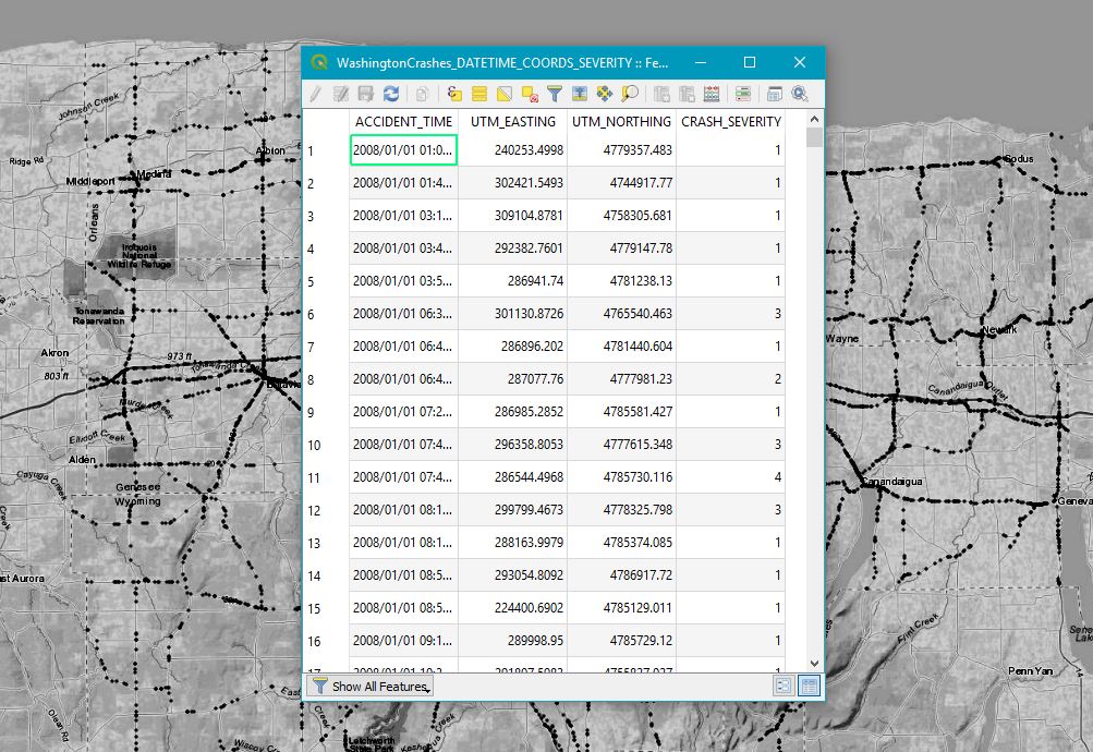 However, after I had loaded it into QGIS and gave it a quick inspection, I noticed a car crashes layer. Slightly morbid I know, but much more interesting than basic line geometry for roads. A quick SQL query later and I had a dataset consisting of X & Y coordinates, this time in NAD83 (UTM Zone 18N), a date and time stamp (in the same column) and a severity index. Whilst I couldn’t find any information regarding what the severity index meant, it intrigued me all the same.