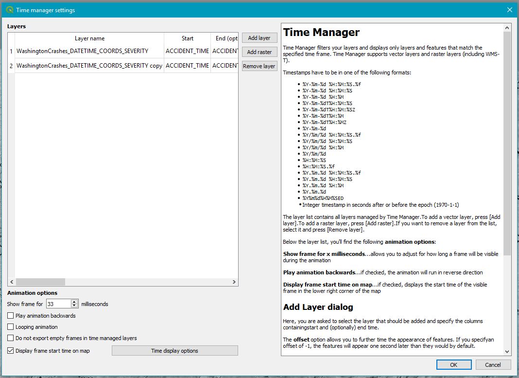 Now as you can see from the Time Manager dialog, all you do is simply load at least one layer, select the column which represents Start Time and (optional) End Time and hit the Green Power button. There are also a bunch of other great customisation settings which are fairly self-explanatory.